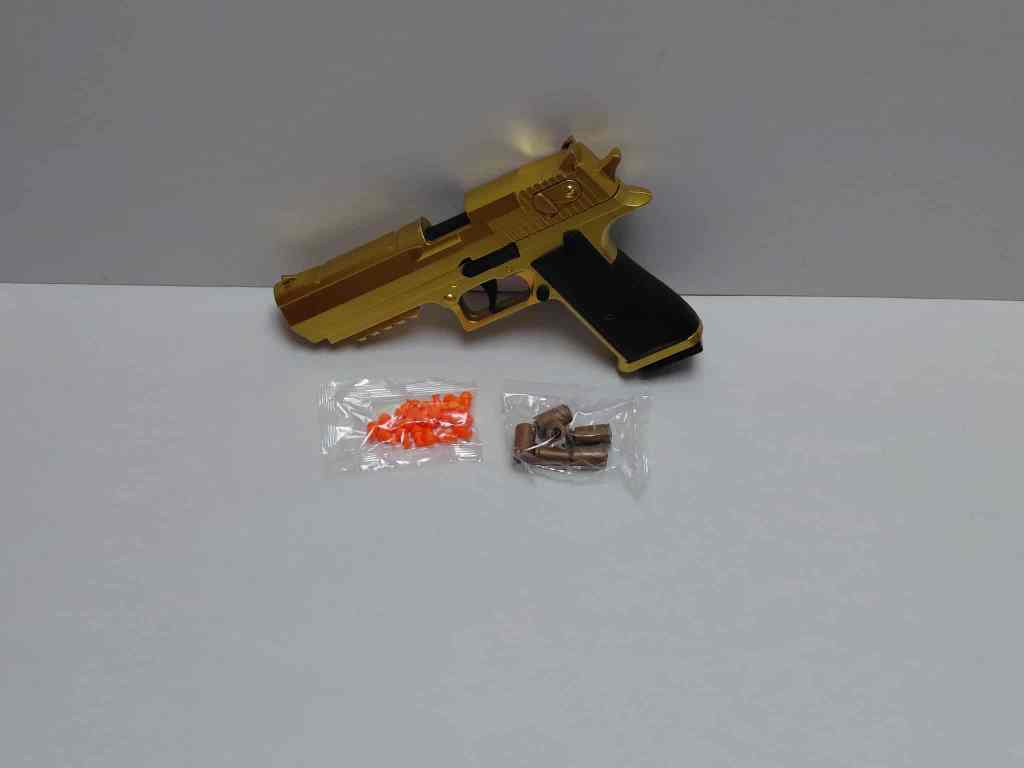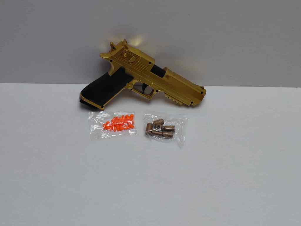 Step into the action with this eye-catching toy handgun, perfect for soldier pretend play and role-playing scenarios. Featuring a bright, metallic finish in your choice of Golden or Silvery, this pistol offers a high-impact look without the need for batteries.