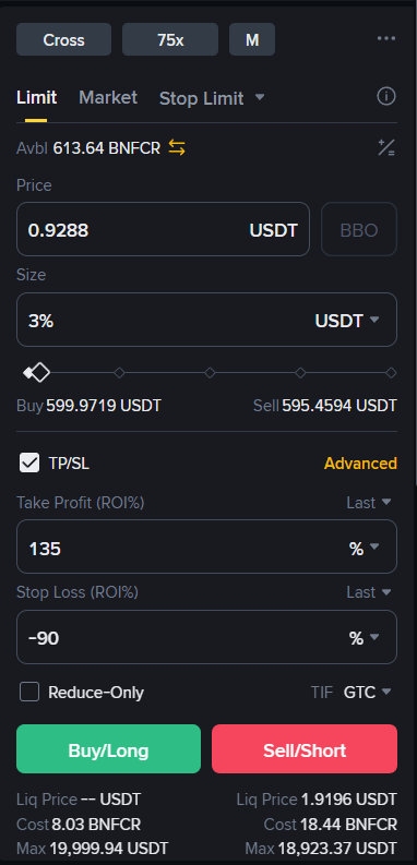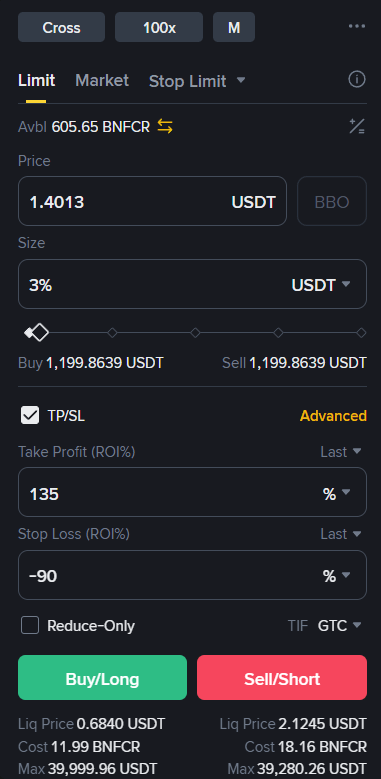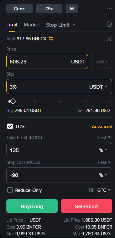 Enter at -90% STOP LOSS (ROI%) at the highest and lowest price divided by 2.