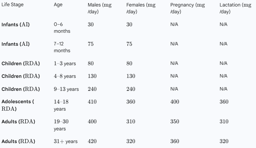 Recommended Dietary Allowance (RDA) and Adequate Intake (AI) for Magnesium